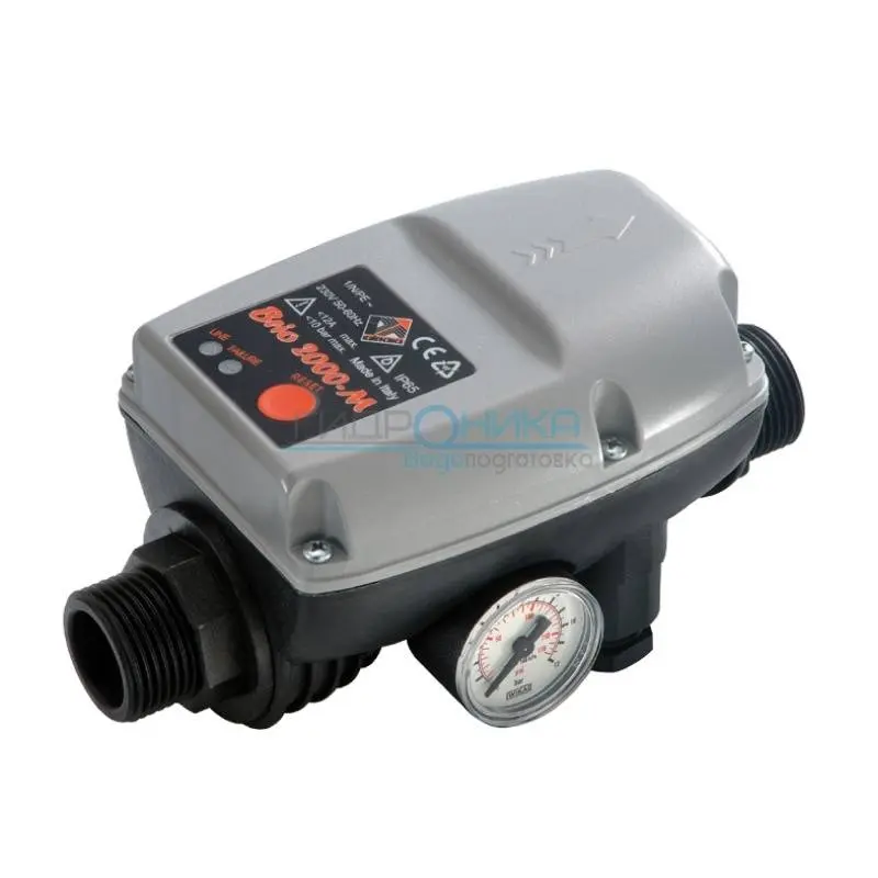 Имеет встроенный обратный клапан и манометр. Включает электронасос после падения давления в системе (открытые краны) и выключает его, когда прерывается поток воды при максимальном значении давления для электрического насоса (краны закрыты). Возможность как вертикальной, так и горизонтальной установки – в соответствии с направлением потока.